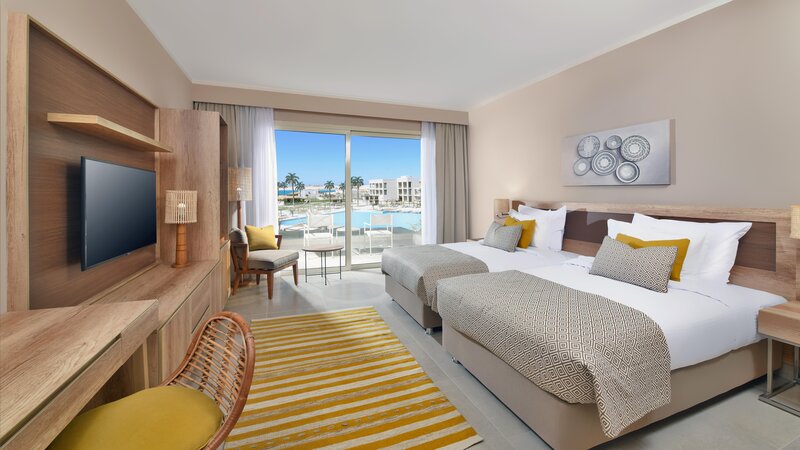 Deluxe-Familienzimmer (FZX/XF3, ca. 60 qm) sind 2 Zimmer mit Verbindungstür mit Balkon oder Terrasse mit Pool- / Meerblick.
