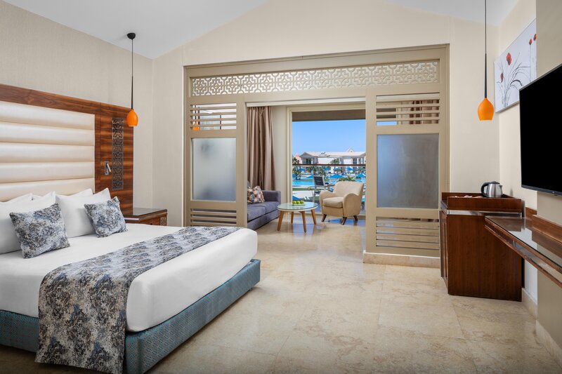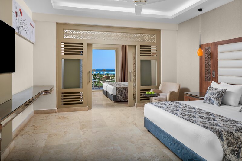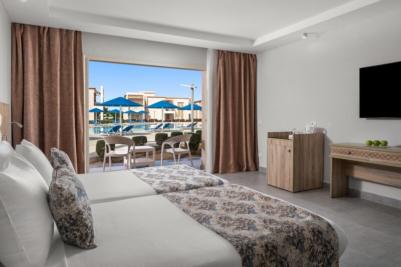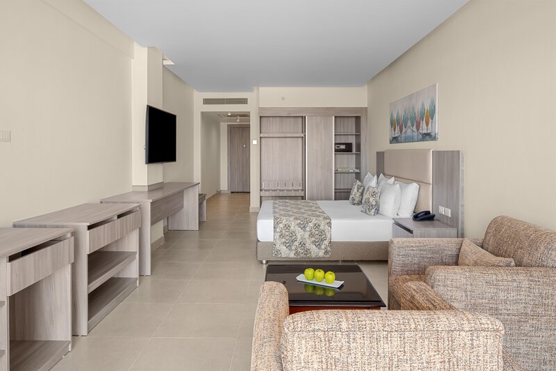 Die Zimmer (ca. 47 m²) sind modern und komfortabel ausgestattet mit Dusche, WC, Föhn, Telefon, Sat. TV, WLAN, Minibar, Safe, Klimaanlage, Balkon/Terrasse mit Poolblick (DPZ/EPZ) oder Meerblick (DZM/EZM). Die Sparzimmer (DZP) haben die gleiche Ausstattung, jedoch geringe Verfügbarkeit. Die Familienzimmer (FV4) sind ebenfalls gleich ausgestattet, jedoch mit 70 m² geräumiger und der Kinderbereich durch eine Schiebetür getrennt, auch mit Meerblick buchbar (FZM). Einzelzimmer sind Doppelzimmer zur Alleinbenutzung.